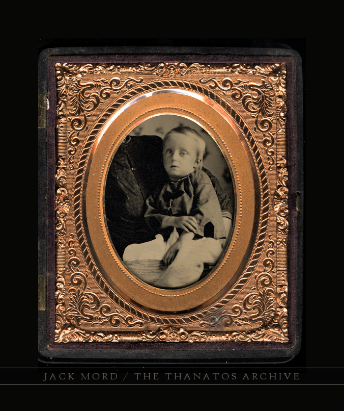 Very sick boy in the lap of his father, who is hidden beneath the mat. He was likely