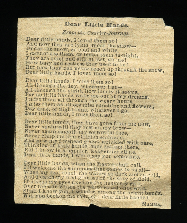 Top photo: “Dear Little Hands” poem found behind the post mortem photo of 5-month-old Charles Gibbud, who died in 1855.
