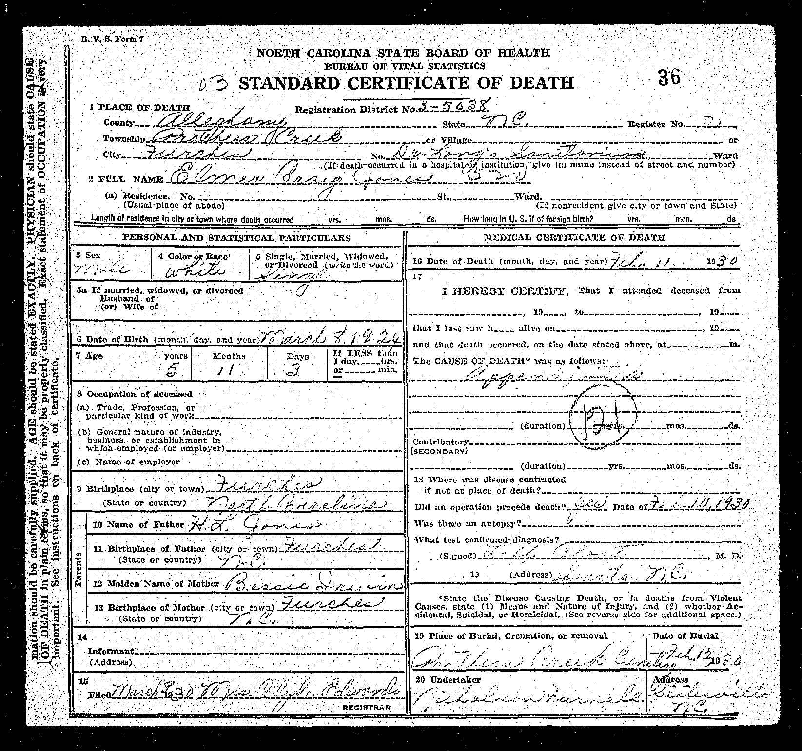 The headstone and death certificate of 5-year-old Elmer Jones, who died of appendicitis. He’s buried at Prathers Creek Cemetery in Laurel Springs, North Carolina. (Grave photo credit: FindAGrave.com).