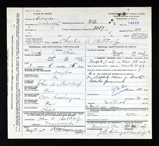 Death certificate of Charles Botdorf, who died from scalding and pneumonia in 1907. Note that his date of birth it wrong on the certificate – he was born in 1904.