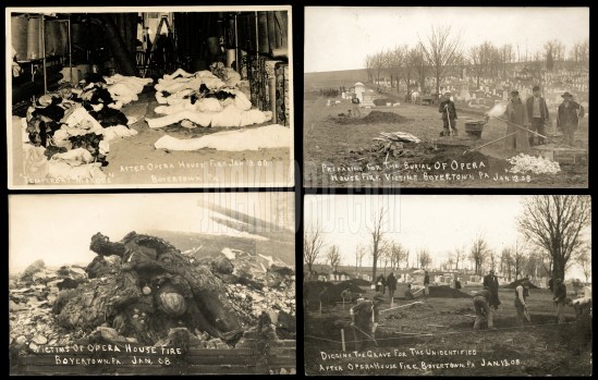 Four 1908 real photo postcards documenting the Rhoads Opera House fire and aftermath. From Wikipedia:
