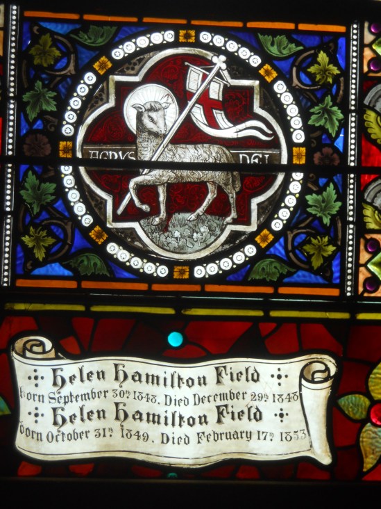 Stained glass memorial window dedicated to the memory of two sisters that were given identical names.