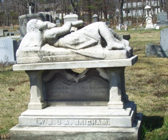 The shared grave of Annie Florence Brigham (b. April 22, 1866) and Alice Brigham (b. April 21, 1864) both of whom died of scarlet fever in 1868 (Alice on May 29, Annie on June 17). The sisters are buried at Main Street Cemetery in Hudson, Massachusetts. If you are an Archive member, a stereoview photo of their grave as it appeared in 1868 is available: Thanatos Archive members