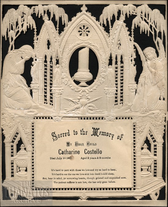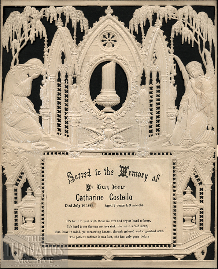 Large (12″ x 10″) memorial die cut for Catharine Costello, a little girl who died at 3 years and 9 months in Lowell, Massachusetts in 1883. Her cause of death was “Paralysis of the heart”. This die cut features many classic mourning symbols, including a broken pillar, draped urn, hourglass, willow trees, and more. Die cut memorials were popular in the middle-to-late 19th century; they are made of heavy embossed paper with cut out sections. The piece shown here has a piece of black paper behind it. Visit the Thanatos Archive to view more of our post mortem and memorial collection. Membership options @ http://www.thanatos.net/membership