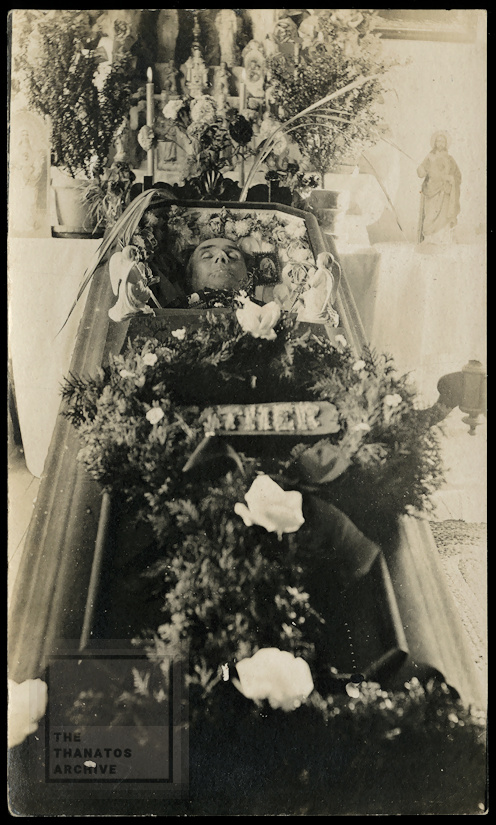 Wisconsin, circa 1912: Man in his casket, on top of which have been placed several religious statues, with even more visible on the altar display in the background. A funeral wreath with the word “Father” has been laid on top of his casket, and a religious photo has been placed next to his head. A second photo of the man’s female relatives praying at the sides of his casket is available here (Thanatos Archive subscription is required. Not yet a member? Memberships available here ).