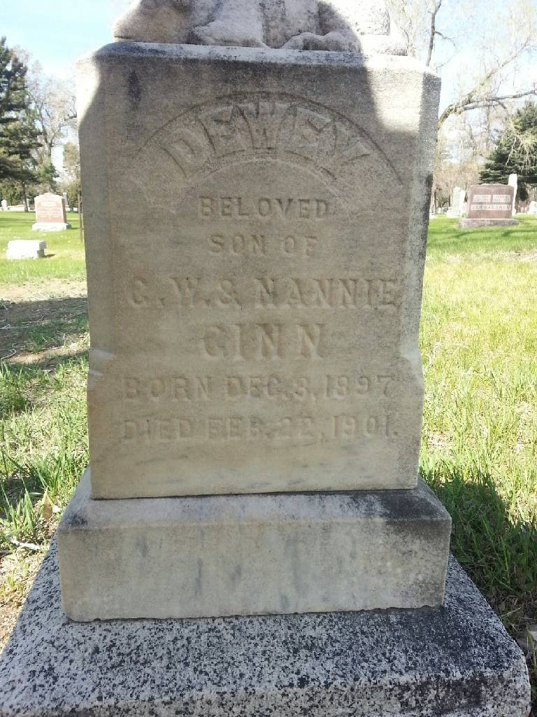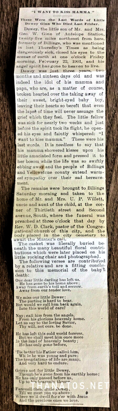 An original obituary and grave marker relating to 3-year-old Dewey Ginn, who died in 1901 in Montana. An original cabinet card of Dewey’s favorite chair covered with funeral flowers and a sign reading “Little Dewey’s Chair” can be found in our collection (Archive subscription required).