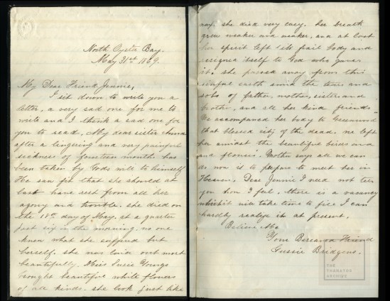 May 1869 letter from Sarah “Gussie” Bridgens to her friend Jennie Tubbs, informing her of Sarah’s sister, Anna’s, death. Anna was born in 1839 and just celebrated her 30th birthday in April. She died of consumption.
