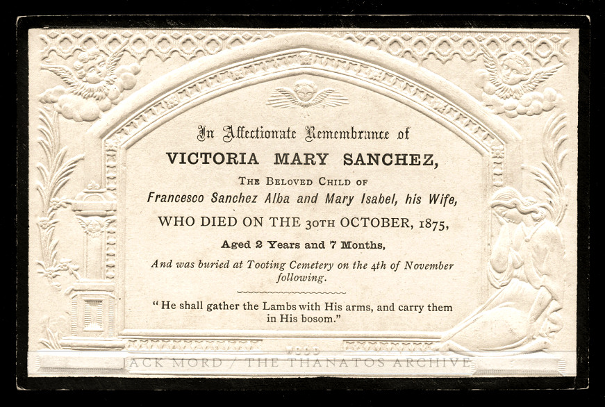 Embossed funeral card for a little girl who died in Lambeth, England in 1875. Her older sister died the following month.